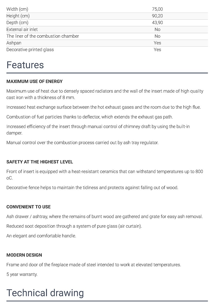 glass - limiting the deposition of soot on the glass 9 Adjust the flow of air through the ash pan 10 Warranty 5 years